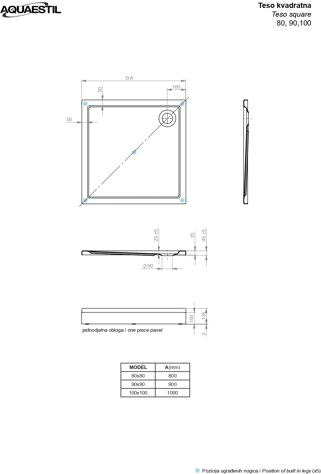 Die quadratische Variante der Duschwanne Teso ist in mehreren Standardgrößen erhältlich.
