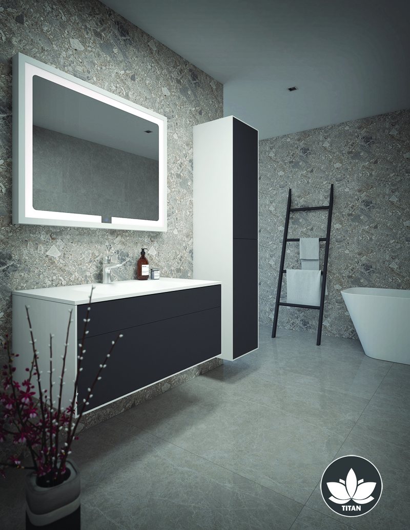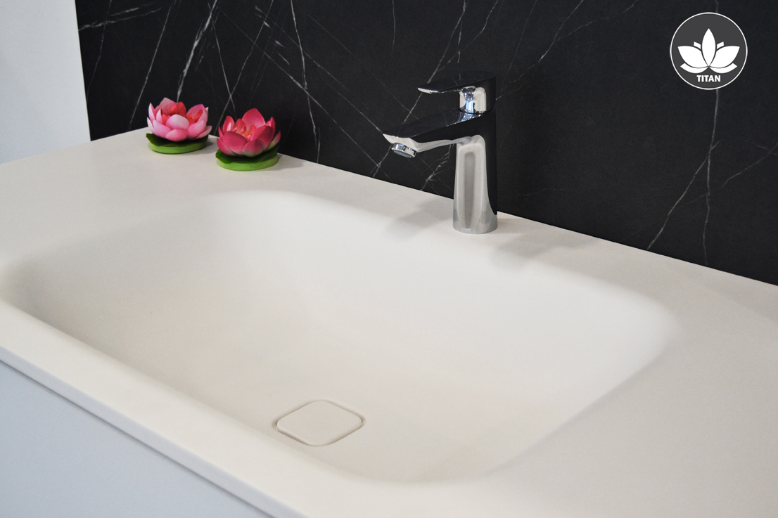 The Titan I premium bathroom furniture consists of a single or double basin and a vanity unit made of the ASTONE composite material, with a front comprising one or two drawers available in a variety of colours and styles.