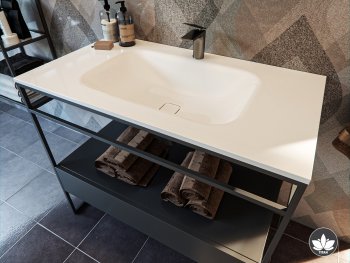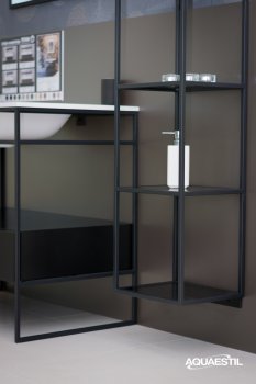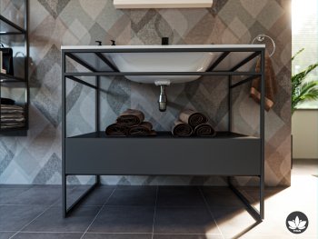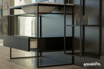 The Titan glam bathroom furniture irresistibly combines a minimalist metal vanity unit in matte black with a spacious drawer and an elegant basin made of a composite material with a silky white matte effect. To complete the impression, combine the composition with the Titan mirror or a mirror with an aluminium frame in matte black.