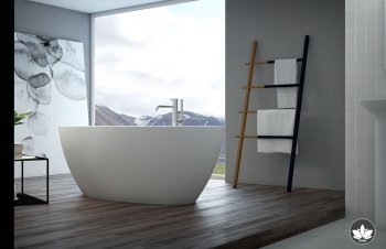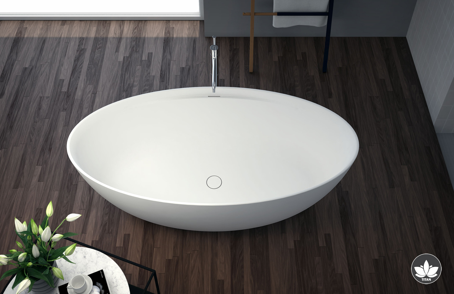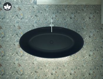 The compact yet extremely spacious Titan oval freestanding bathtub accentuates the attractive lines gained through careful processing of the ASTONE material.
