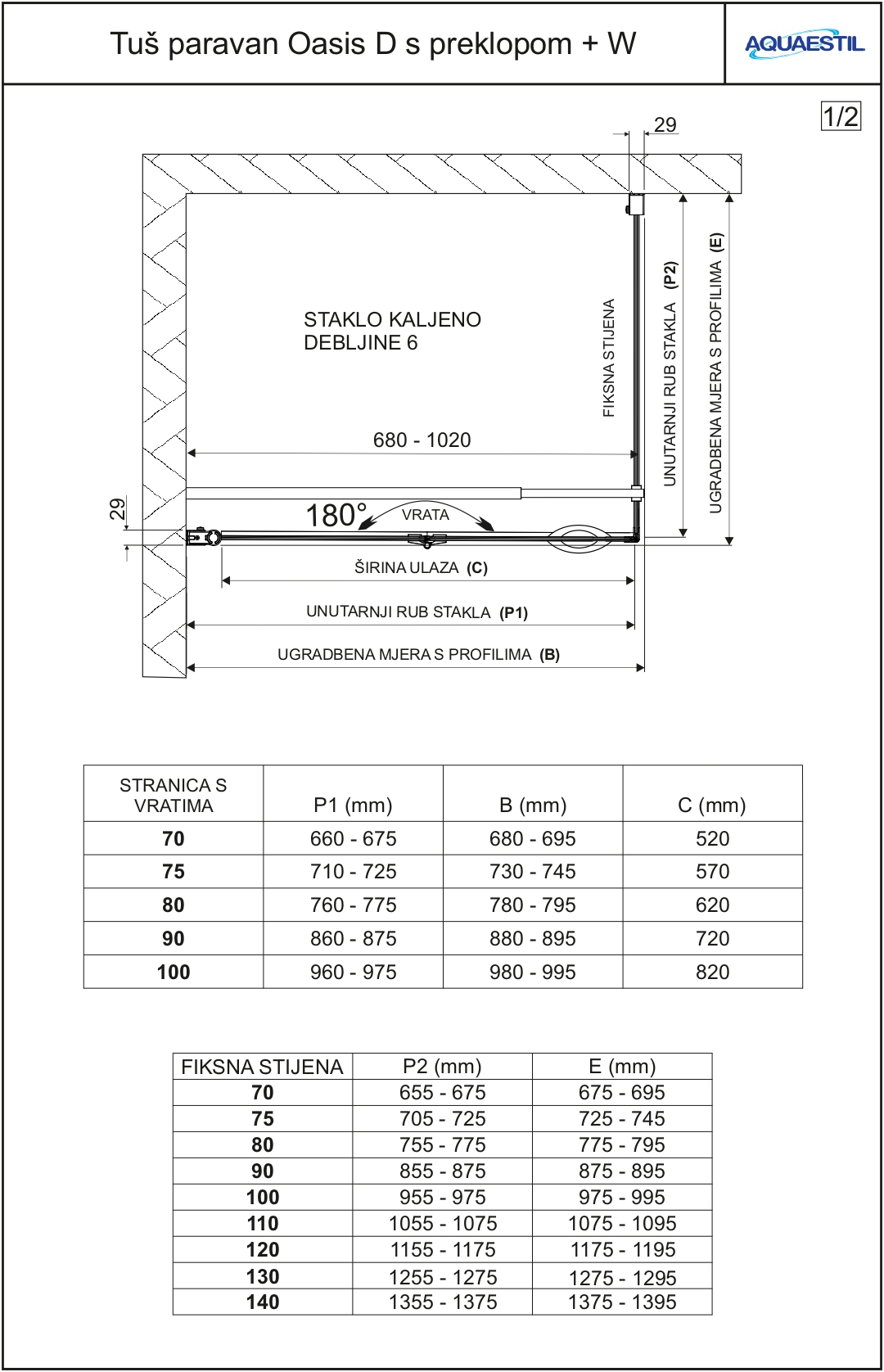 Oasis D+W s preklopom je sestavljen iz ene fiksne stene „W“ ter vrat „D“, katera se lahko preklopijo v obe smeri, s ciljem olajšanega vstopa. Zaradi višine 200 cm je primeren za vgradnjo na nizke tuš kadi. Pri naročanju paravana z reliefnim steklom je potrebno definirati orientacijo vrat (levo ali desno).