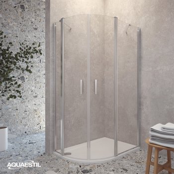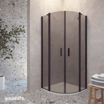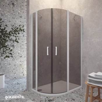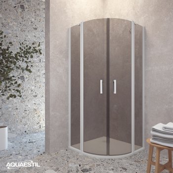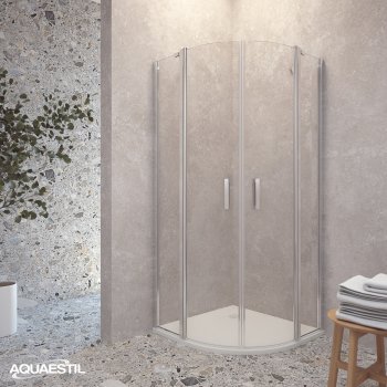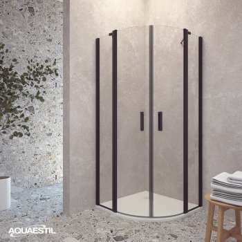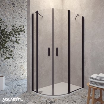 A modern semicircular shower enclosure consisting of two "D" panels with doors. Each panel consists of a hinged door and a fixed section. The enclosure features elegant profiles available in silver, black matte, or white matte finishes and 6 mm tempered glass with a factory-applied anti-scale nano-coating. Magnetic seals and a lift door system ensure excellent functionality and splash protection.