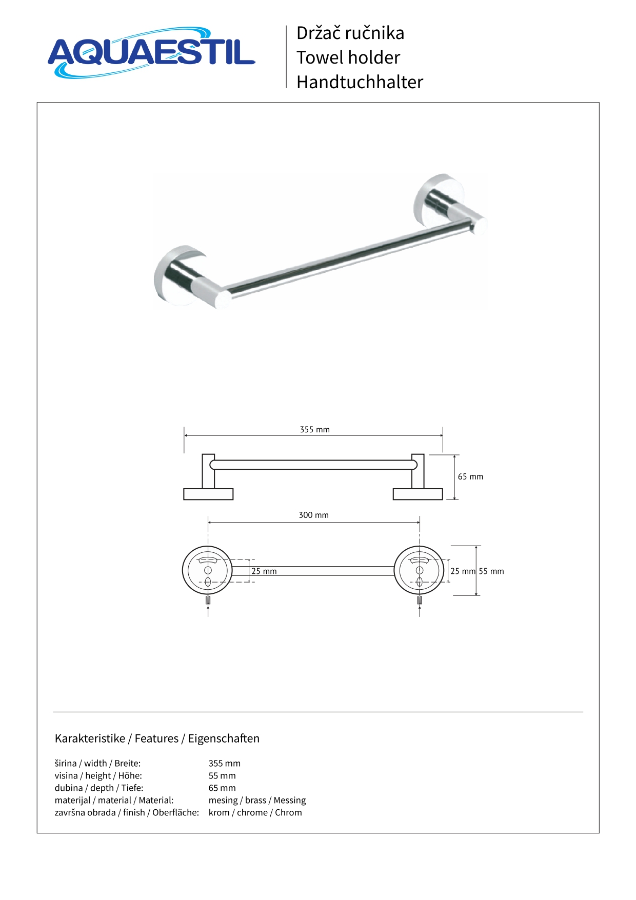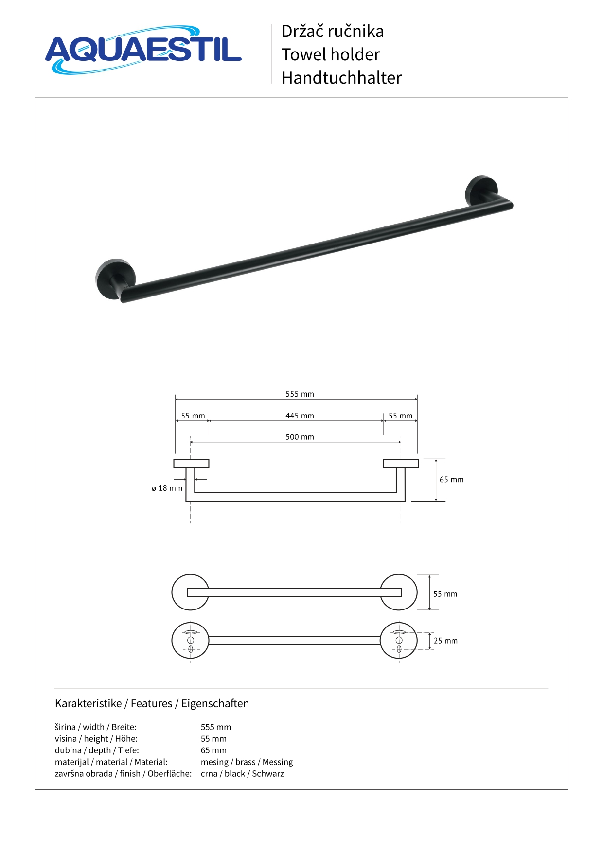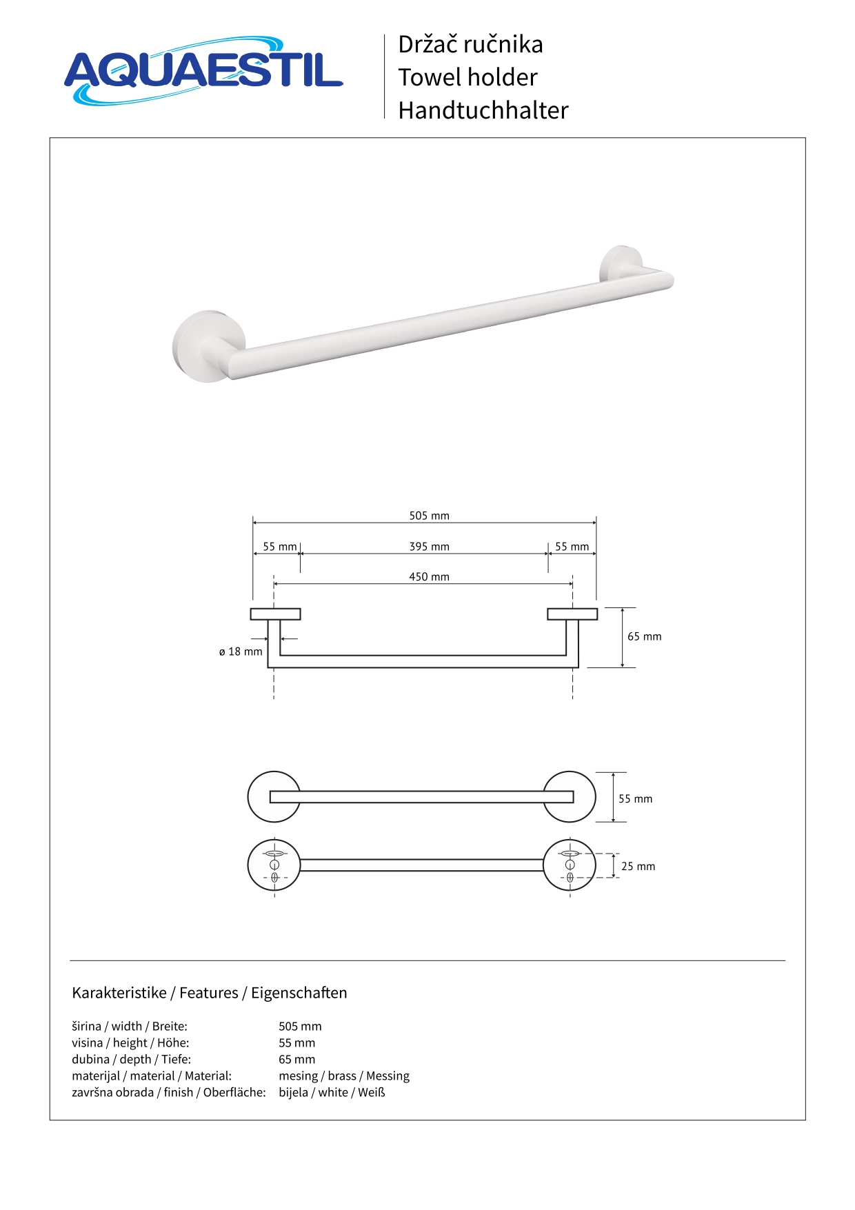 Elegantni i funkcionalni držač ručnika izrađen od mesinga u kromiranom (30 cm), bijelom mat (45 cm), ili crnom mat (50 cm) efektu.