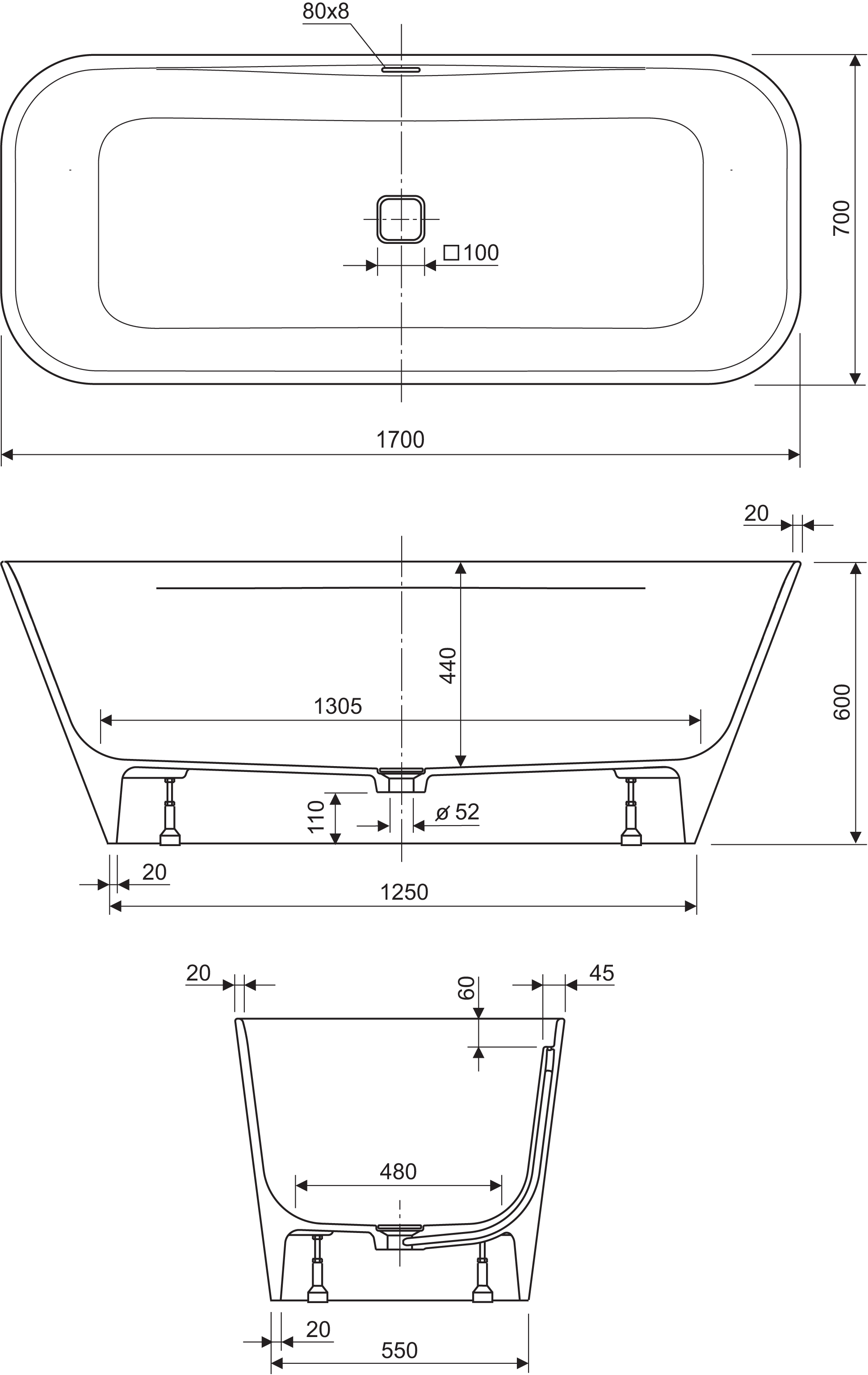 - Kadar se dobavlja z montiranimi nogicami in prelivno-odlivno garnituro z »režastim« prelivom in »klik-klak« ventilom sifona.