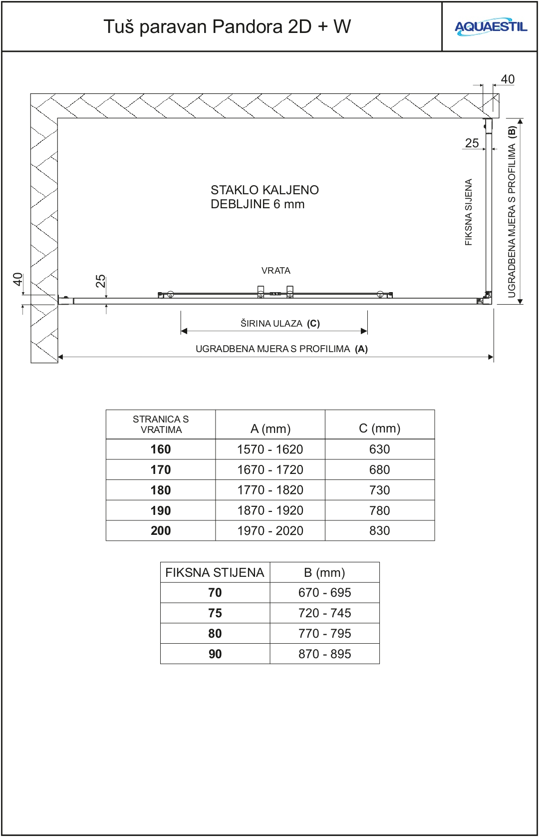 Pandora 2D+W je paravan namenjen večjim pravkotnim kadem, umeščenim med dvema stenama. Ponuja najvišjo raven zaščite pred špricanjem vode. Sestavljen je iz fiksne stene, katera se montira na krajšo stran kopalne kadi, in dvojnih drsnih vrat.